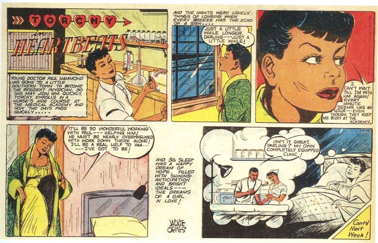 1950 brought the reintroduction of Mrs. Ormes’ Torchy Brown, who was no longer a teenage performer but now an independent woman looking for love and a place in this world while taking on issues of the day, particularly civil rights, in a new full-color title, Torchy Brown in Heartbeats. In 1957, Mrs. Ormes retired from comics but continued to create fine art and living a busy social life throughout the Chicago area.