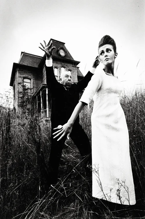 Ina in a Jane Derby dress and Alfred Hitchcock, Universal Studios, Hollywood, Harper’s Bazaar, 1962 (x) from vintagegal